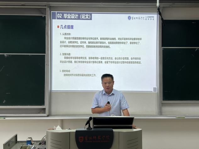 为明确大四学年核心任务,帮助学生科学规划时间、提升实践能力与学术素养,9月14日下午,学院分别于通榆校区主楼 B305 教室及大数据产业园信创软件产业基地召开2026届毕业生专业实习与毕业设计动员会。学院副院长吕伟鹏主持会议,院长朱立才教授出席并作总结讲话。