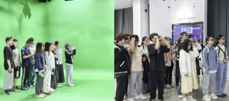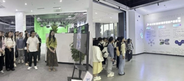 在长三角数字视听产业基地展厅,企业工程师系统介绍了短视频与人工智能产业的发展现状与未来趋势,帮助学生形成对行业前景的直观认识。随后,师生走进技术体验区,依次参观并体验了偏振3D大屏、AI数字人建模、多人动捕采集、XR数字影棚等前沿技术展示区域。在3D真人手办区,同学们近距离了解了基于光学采集与AI建模的快速人像数字化流程;在绿幕特效区,大家亲身参与虚拟拍摄与实时合成环节,感受数字内容创作的科技魅力。