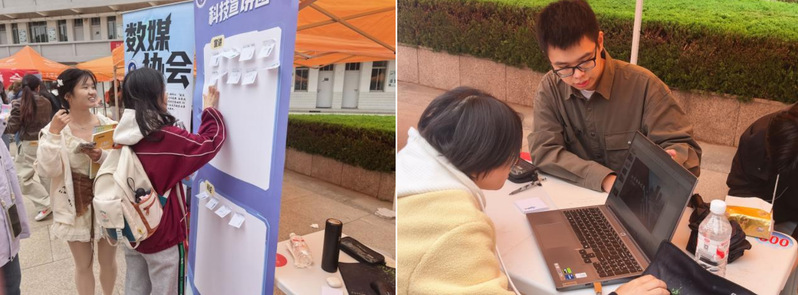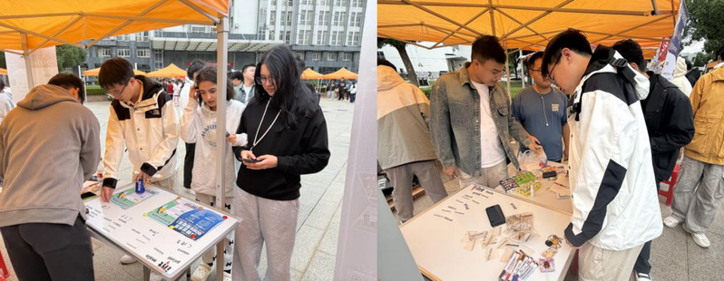 科技宣讲团:思维碰撞展现语言与逻辑魅力。科技宣讲团设置了“态度墙”互动区,围绕“AI发展趋势”“科技与生活融合”等热点议题,鼓励新生畅所欲言、交流观点。现场还设有“宣讲”与“辩论”两类体验区,新生可根据兴趣选择参与,在轻松互动中感受语言表达与逻辑思辨的独特魅力。工作人员通过发放传单、展示往期活动成果等方式,生动呈现社团特色,帮助新生迅速了解并融入社团文化。