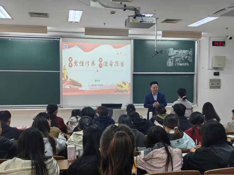 10月29日下午,人工智能学院党委副书记、院长朱立才在主楼B312教室,为入党积极分子主讲《锤炼党性修养 践行使命担当》专题党课。党课由学生第一党支部书记毛阿璇主持,69名入党积极分子参与学习。