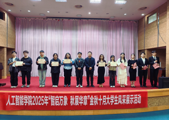 金秋十月大学生风采展示活动是我院迎新系列传统活动之一,活动的圆满举办充分表现了青年大学生的组织协作能力,也展现出25级新生的青春个性风采。未来,人工智能学院将持续开展形式多样、内涵丰富的校园文化活动,在科技与人文的交融中为我院学子创造更多展现自我、互助成长的实践机会,让青春的活力与创造力在积极向上的校园氛围中持续绽放,为学院发展注入源源不断的青春动能。
