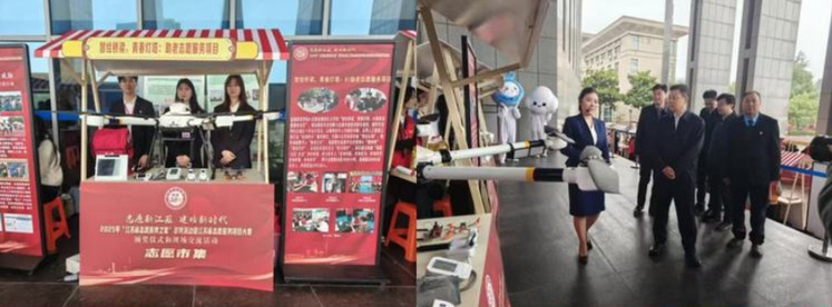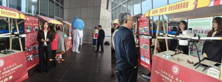 在志愿市集展区,我院“智绘桥梁,青春灯塔:助老志愿服务项目”主题展台精心布置,集中展示了助老服务成果中无人机、智能机器狗、便携式AI体检包等智能设备,并进行了无人机现场操控演示,吸引众多与会领导、嘉宾和志愿者代表驻足交流。展台生动呈现了人工智能技术在助老服务等志愿场景中的创新应用,体现了我院“科技+志愿”融合实践的初步成果。